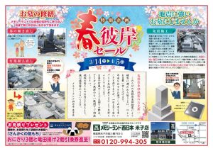 春彼岸セールと同時に今年の1月に発生した島根東部と鳥取西部の震災復興も祈念して 震災復興価格にて特別にて、地震で被害にあわれた方へお客様の墓所の据え直しや傾き直し、部品交換のご相談会も承っております。